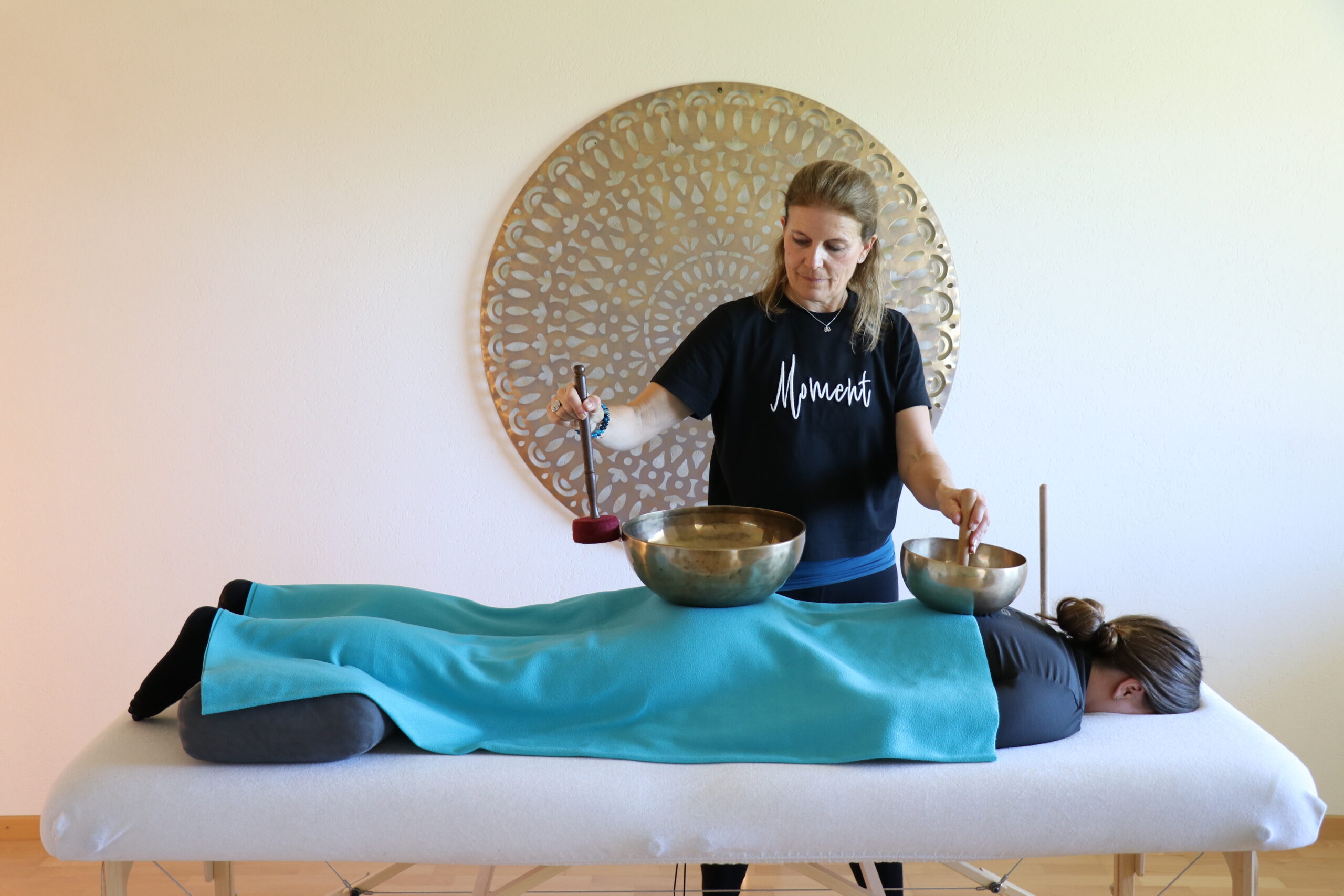 Pendant que vous êtes bien installés avec l’aide des coussins, blocs et couverture, je pose le ou les bols tibétains sur votre corps habillé. En jouant et en activant doucement les bols, les vibrations sont libérées, ce qui harmonise le corps, l’esprit et l’âme et mobilise les pouvoirs d’auto-guérison.